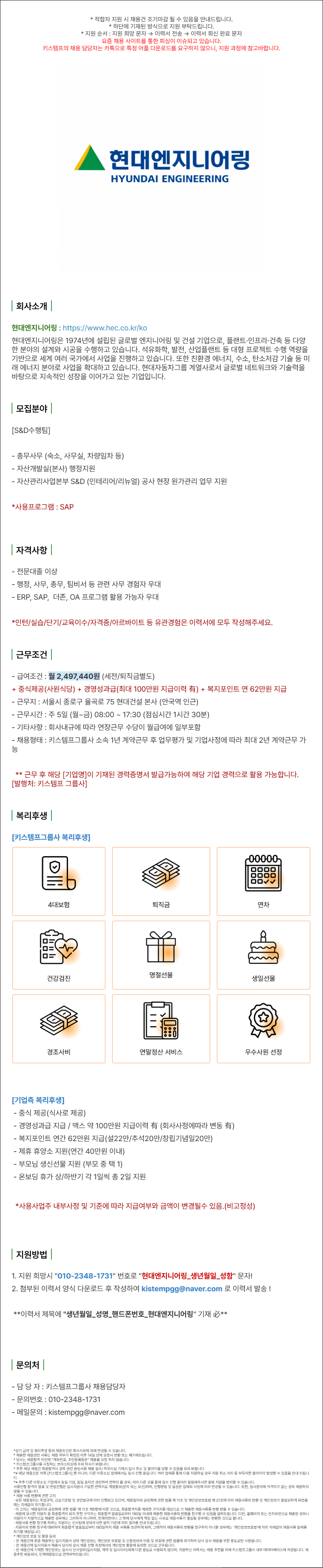[¾È±¹¿ª/´ë±â¾÷/½ÅÀÔ°¡´É] Çö´ë¿£Áö´Ï¾î¸µ Ãѹ«/ÇàÁ¤»ç¹«Á÷ ä¿ë